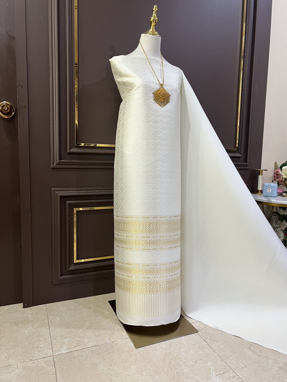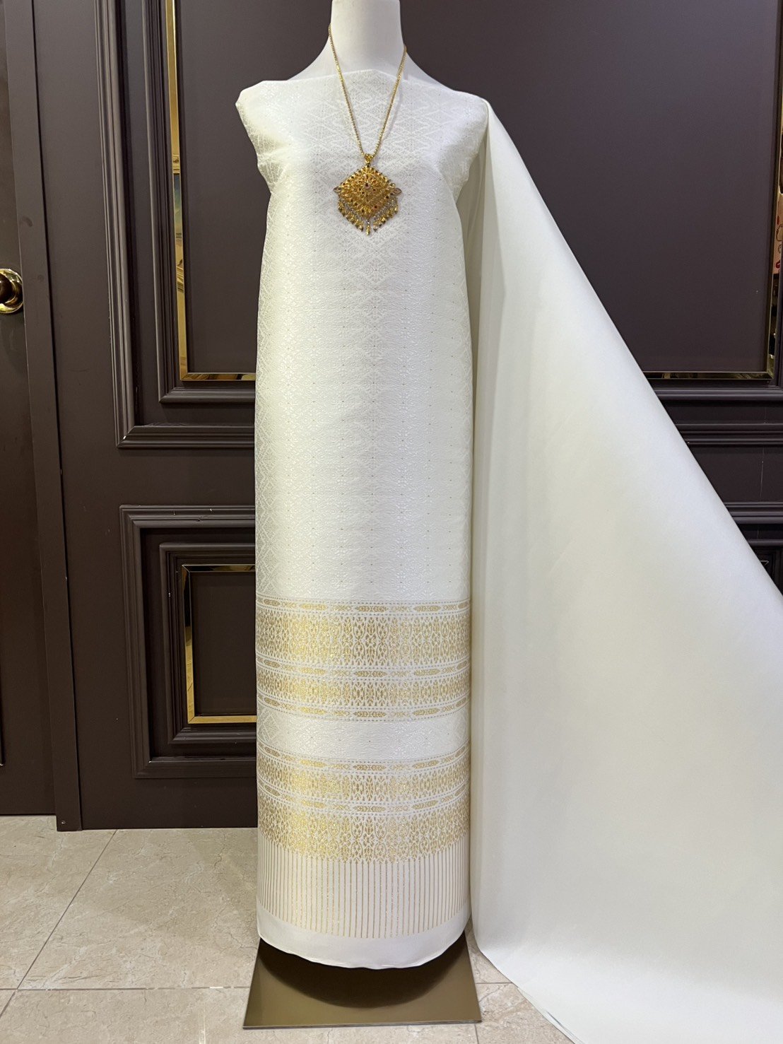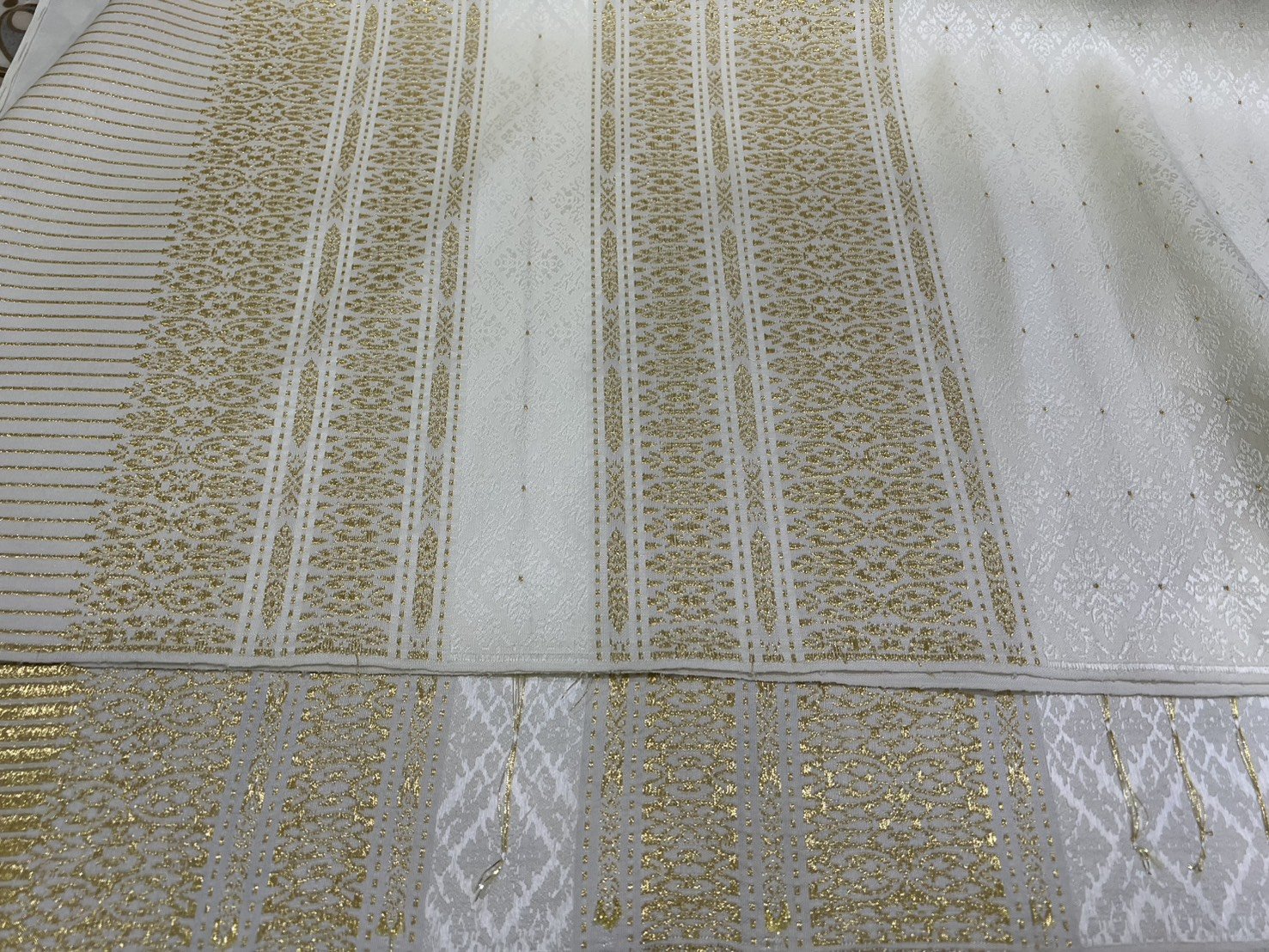ลายราชสำนัก ผ้าไหมยกดอกลำพูนสีขาวงาช้างเกาะเชิงดิ้นทอง