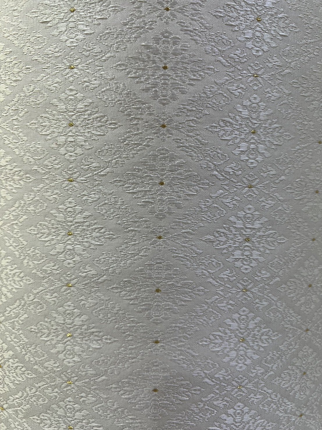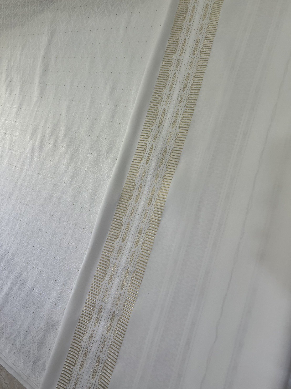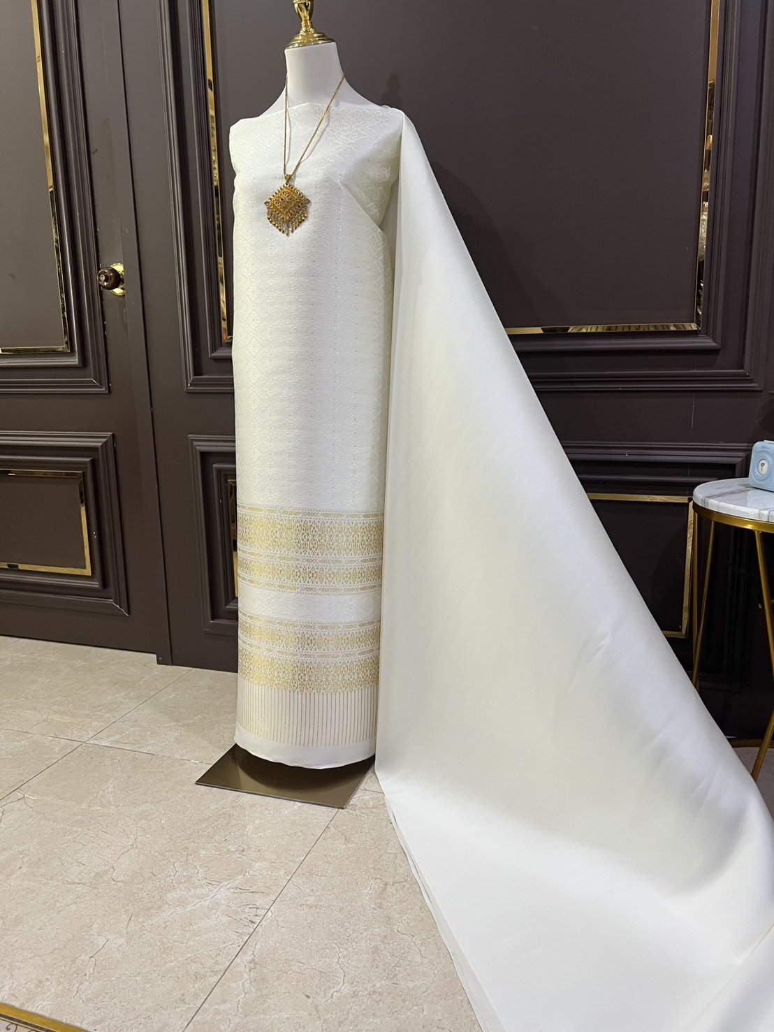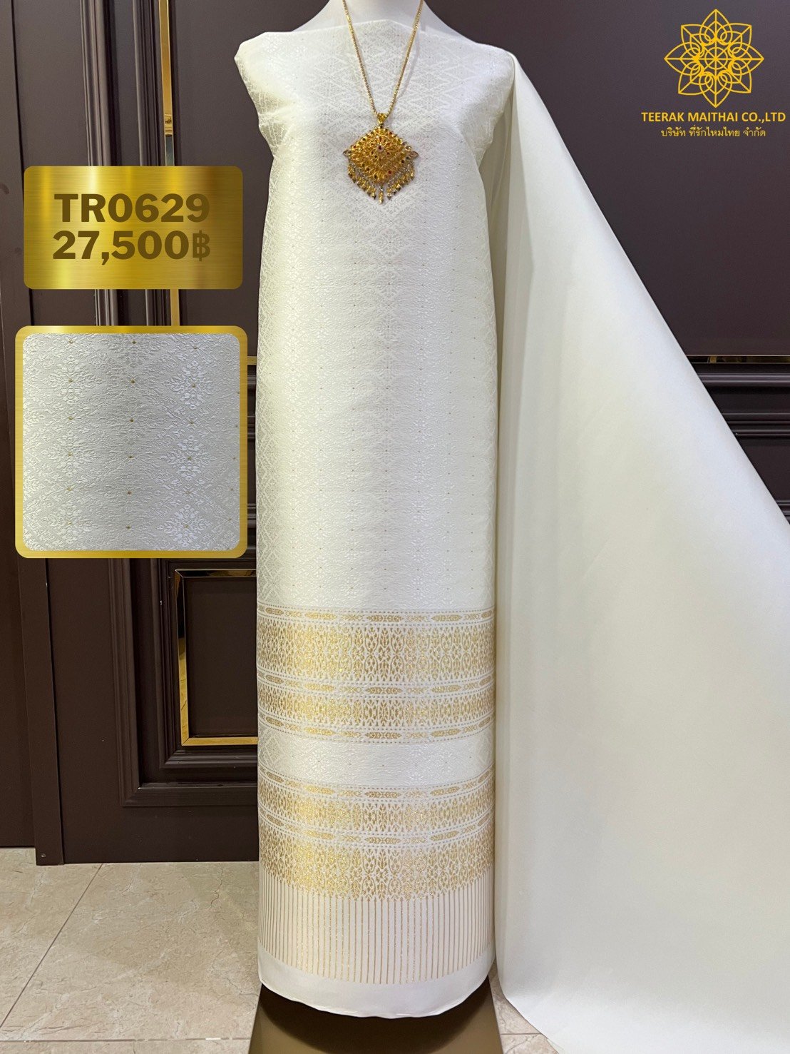 ลายราชสำนัก ผ้าไหมยกดอกลำพูนสีขาวงาช้างเกาะเชิงดิ้นทอง